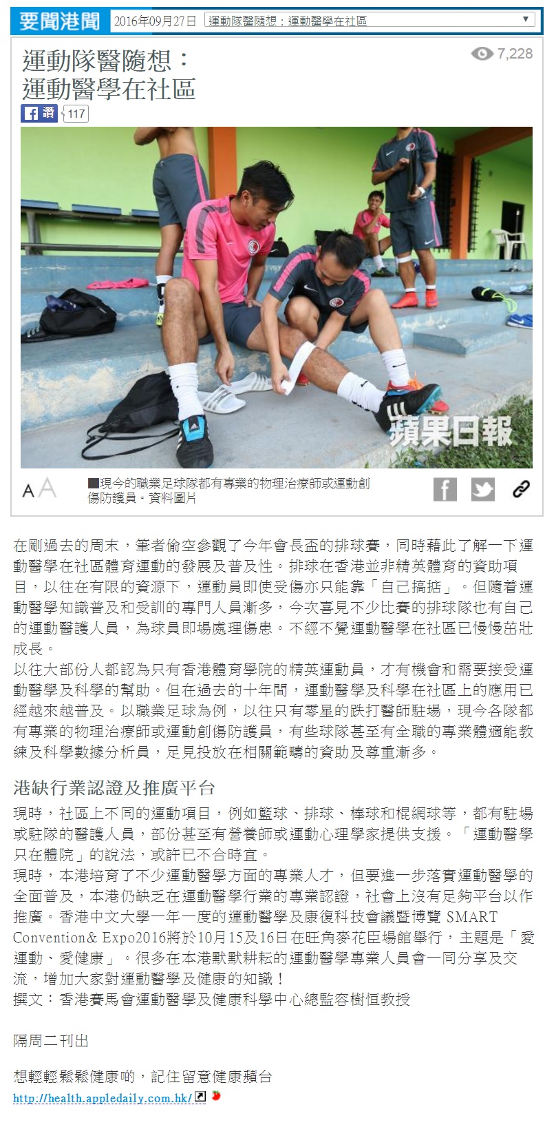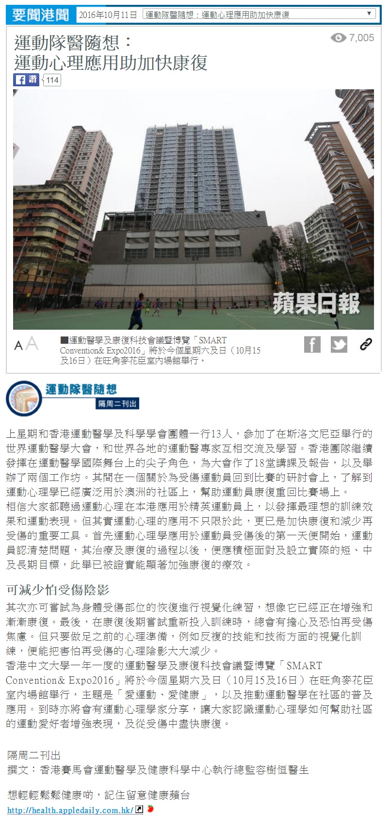 2016年10月11日 蘋果日報:運動心理應用助加快康復