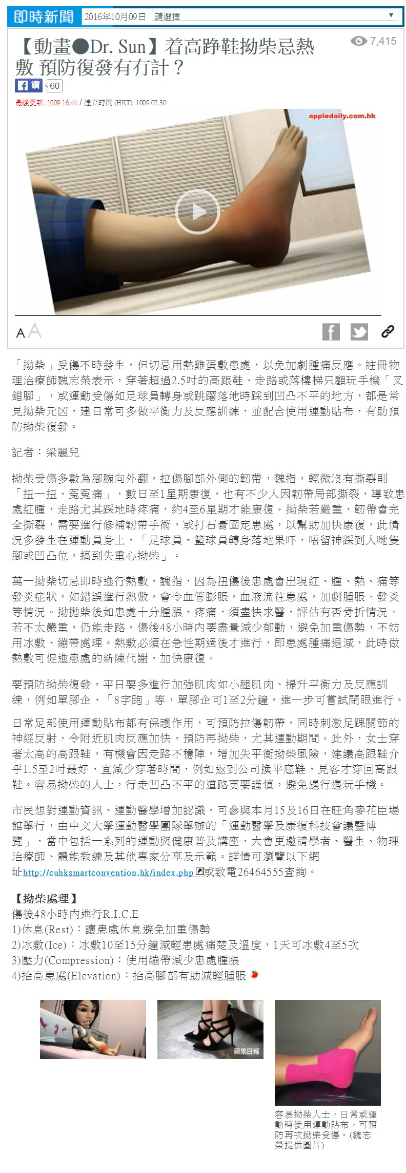 2016年10月09日 蘋果日報:着高踭鞋拗柴忌熱敷 預防復發有冇計?