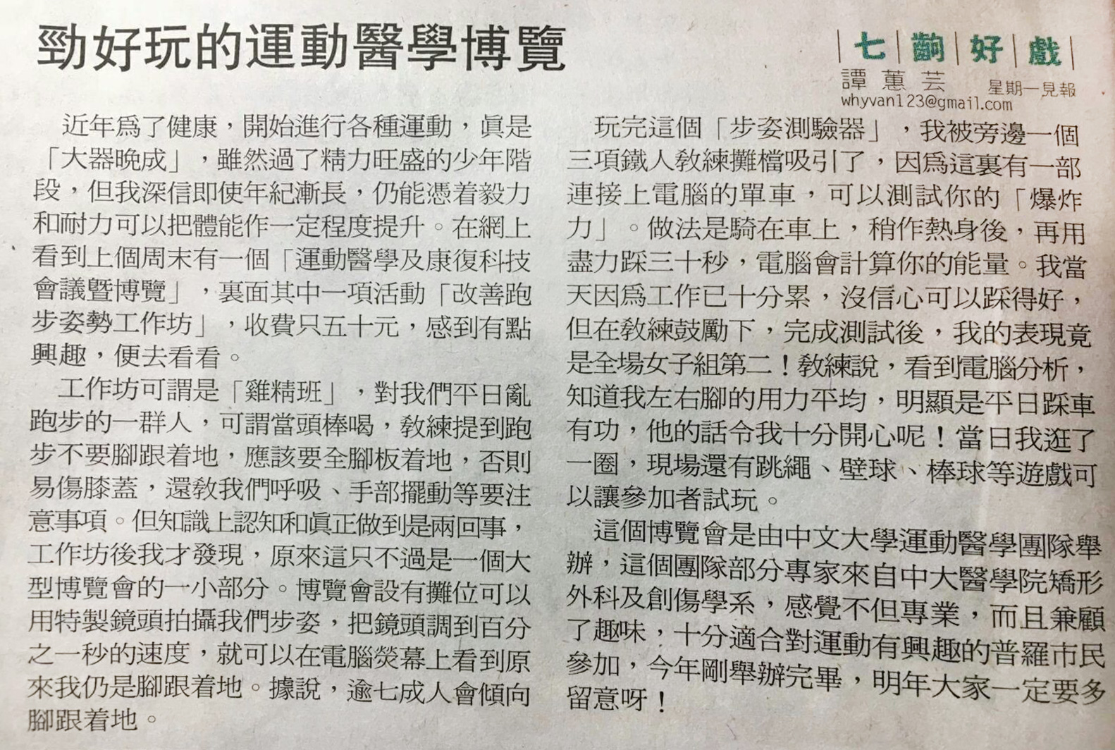 2016年10月24日 明報:勁好玩的運動醫學博覽